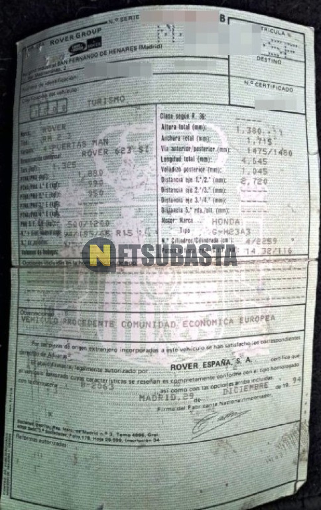 Subasta de Rover 623 Si 1995 Averiados, Marca Rover, Modelo 623 Si, Combustible Gasolina, Kilometraje 155.000 KM, Fecha 1ª matriculación 03/1995, Matrícula M****SF, Color Exterior , Color Interior , IVA REBU y Ubicación Segovia.