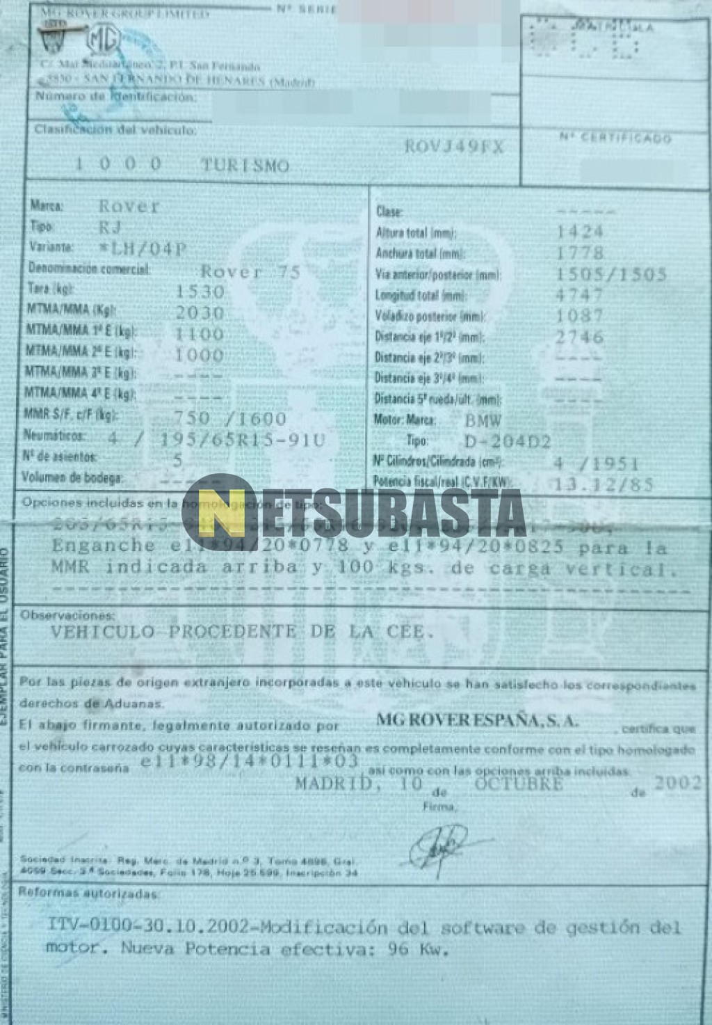 Subasta de Rover 75 2.0 CDT 2002 Siniestrados, Marca Rover, Modelo 75 2.0 CDT , Combustible Diésel, Kilometraje 370.000 KM, Fecha 1ª matriculación 11/2002, Matrícula ****CCB, Color Exterior , Color Interior , IVA REBU y Ubicación Guadalajara.