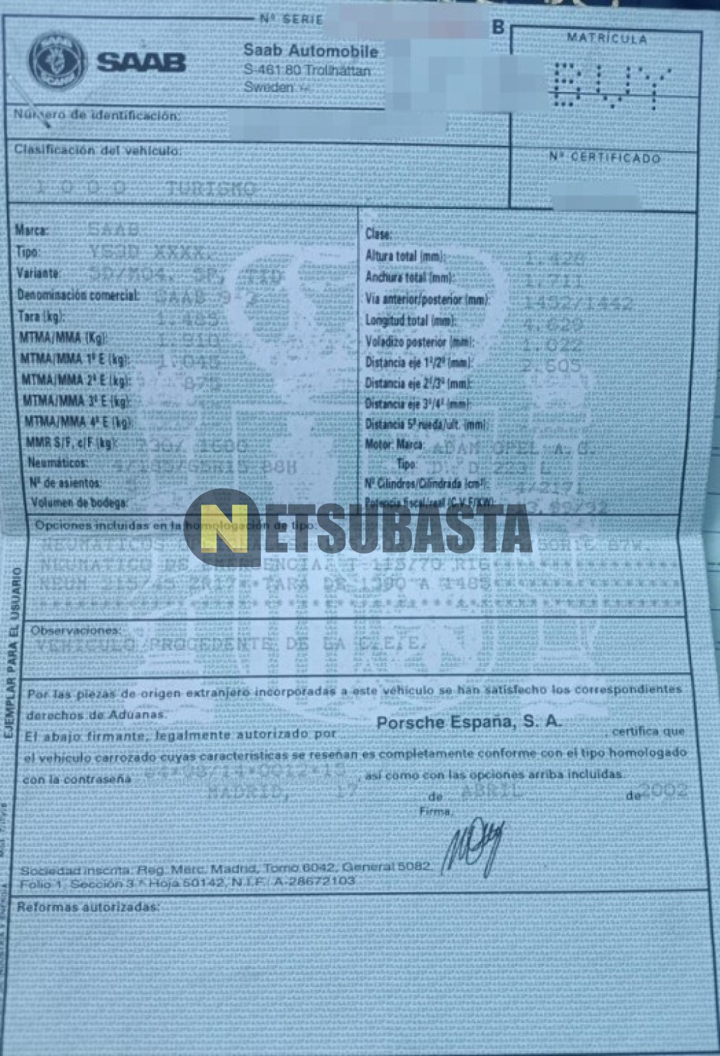 Subasta de Saab 9-3 2.2 TID 2002 Siniestrados, Marca Saab, Modelo 9-3 2.2 TID, Combustible Diésel, Kilometraje 246.000 Km, Fecha 1ª matriculación 05/2002, Matrícula ****BVY, Color Exterior , Color Interior , IVA REBU y Ubicación Valencia.