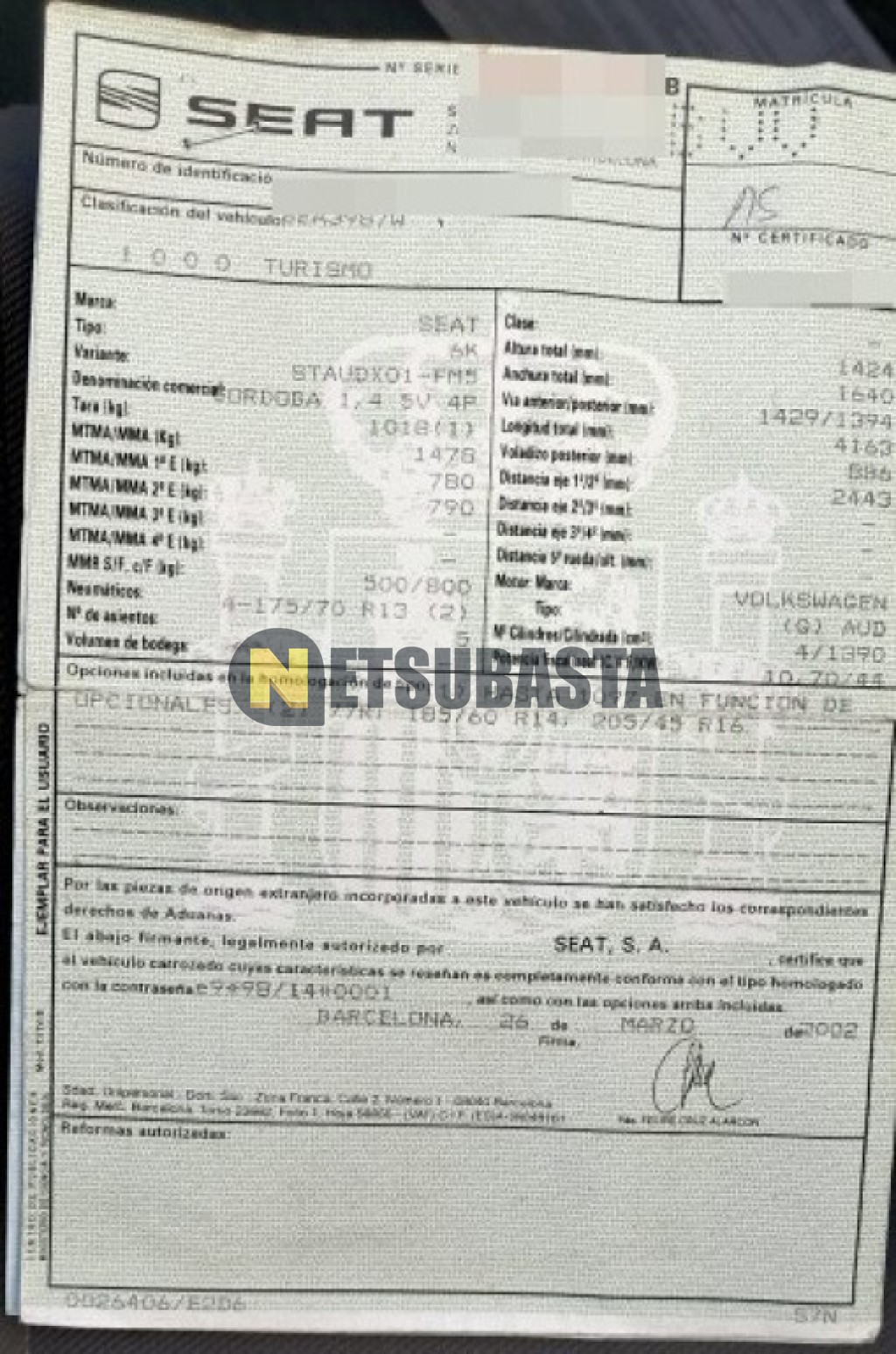 Subasta de Seat Córdoba 1.4 2002 Averiados, Marca Seat, Modelo Córdoba 1.4, Combustible Gasolina, Kilometraje 100.000 KM, Fecha 1ª matriculación 04/2002, Matrícula ****BVV, Color Exterior , Color Interior , IVA REBU y Ubicación Huelva.