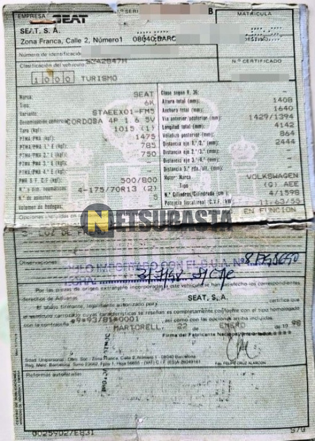 Subasta de Seat Cordoba 1.6 1998 Averiados, Marca Seat, Modelo Cordoba 1.6, Combustible Gasolina, Kilometraje 310.000 KM, Fecha 1ª matriculación 08/1998, Matrícula TF****BS, Color Exterior , Color Interior , IVA REBU y Ubicación Santa Cruz de Tenerife.