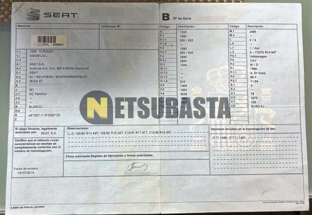 Subasta de Seat Ibiza ST 1.6 TDI 2014 Averiados, Marca Seat, Modelo Ibiza ST 1.6 TDI, Combustible Diésel, Kilometraje 257.000 KM, Fecha 1ª matriculación 07/2014, Matrícula ****HYL, Color Exterior , Color Interior , IVA REBU y Ubicación Málaga.