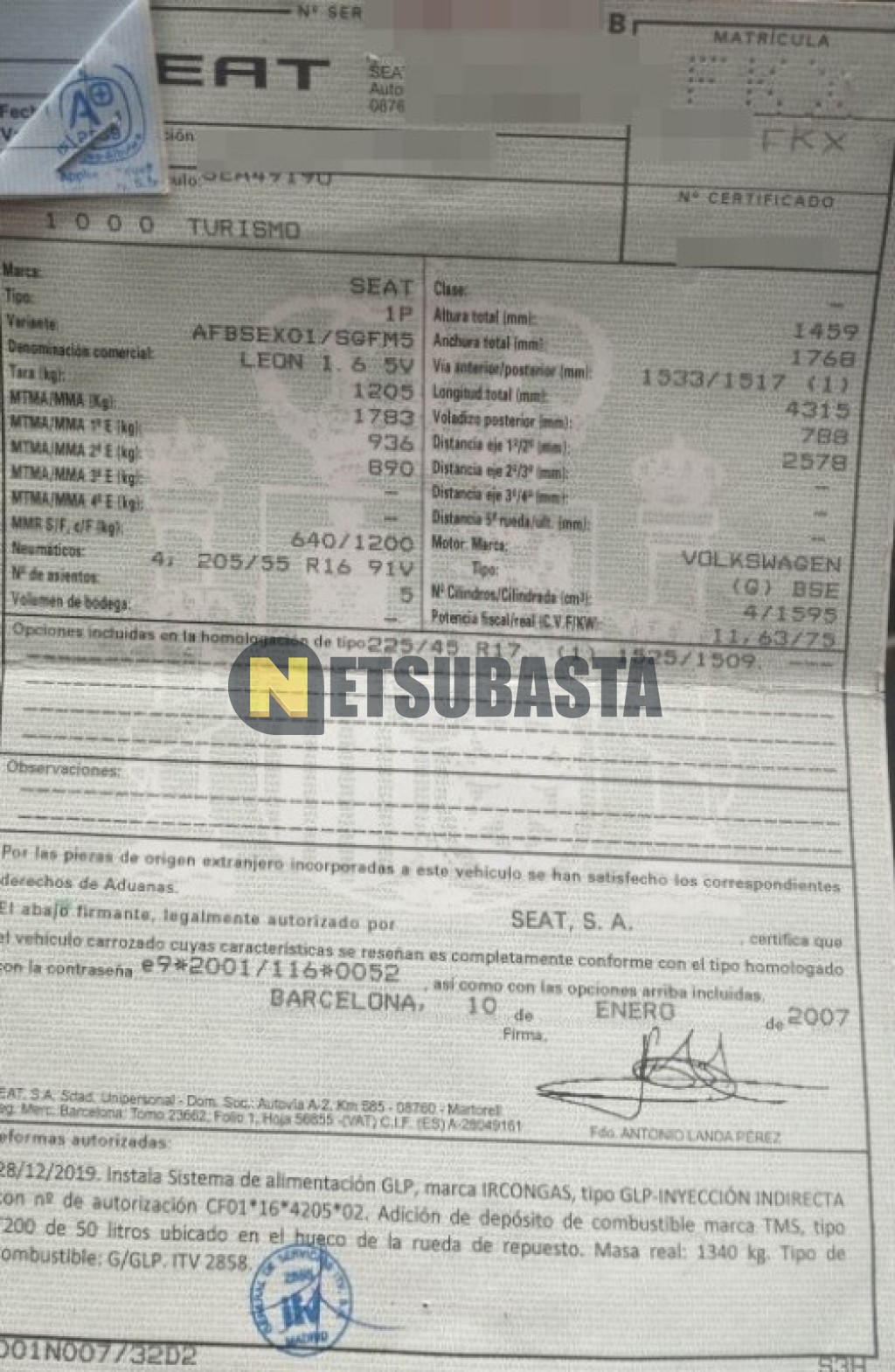 Subasta de Seat Leon 1.6 GLP 2007 Averiados, Marca Seat, Modelo Leon 1.6 GLP, Combustible Gasolina / GLP, Kilometraje 270.000 KM, Fecha 1ª matriculación 01/2007, Matrícula ****FKX, Color Exterior , Color Interior , IVA REBU y Ubicación Madrid.