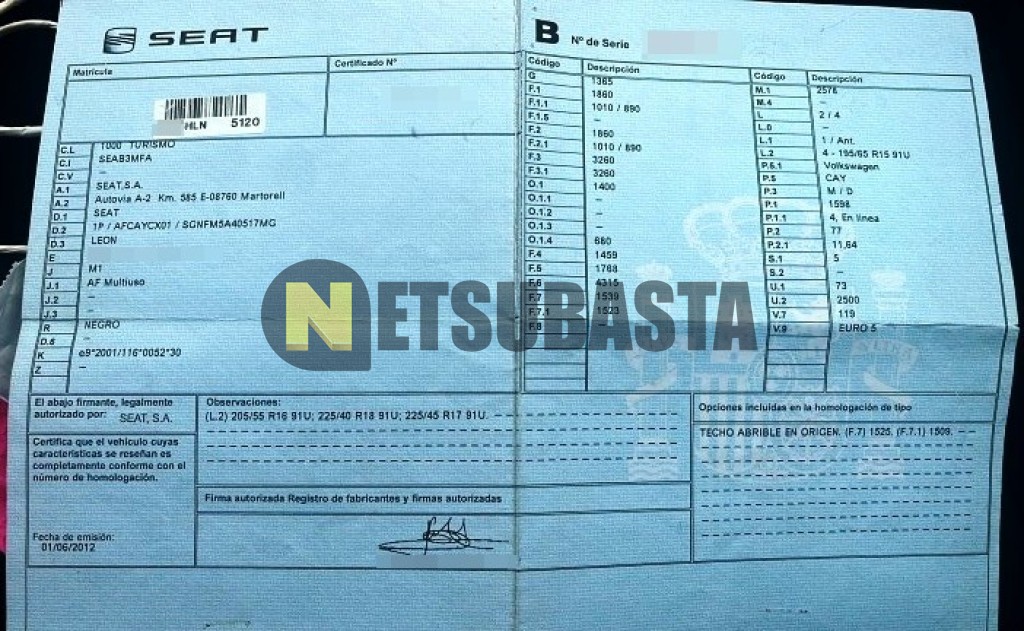 Subasta de Seat León 1.6 TDI CR 2012 Siniestrados, Marca Seat, Modelo León 1.6 TDI CR, Combustible Diésel, Kilometraje 259.000 KM, Fecha 1ª matriculación 07/2012, Matrícula ****HLN, Color Exterior , Color Interior , IVA REBU y Ubicación Huelva.