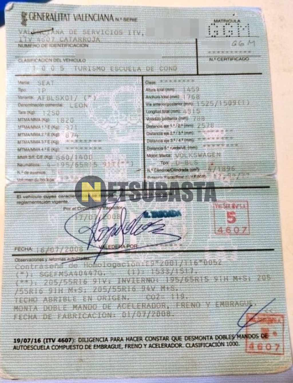 Subasta de Seat León 1.9 TDI 2008 Averiados, Marca Seat, Modelo León 1.9 TDI, Combustible Diésel, Kilometraje 130.000 KM, Fecha 1ª matriculación 07/2008, Matrícula ****GGM, Color Exterior , Color Interior , IVA REBU y Ubicación Valencia.