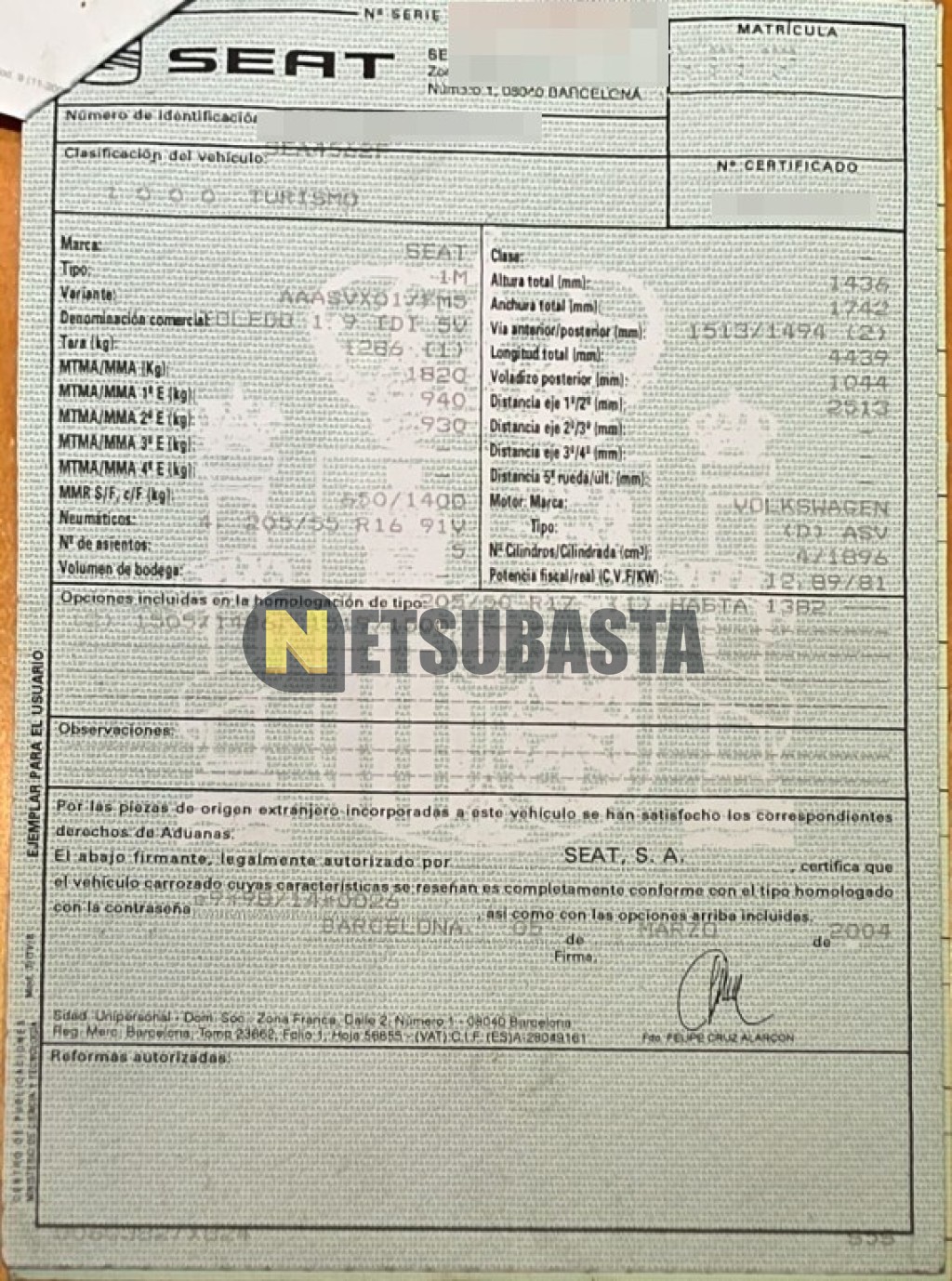 Subasta de Seat Toledo 1.9 TDI 2004 Averiados, Marca Seat, Modelo Toledo 1.9 TDI, Combustible Diésel, Kilometraje 370.000 KM, Fecha 1ª matriculación 12/2004, Matrícula ****DDZ, Color Exterior , Color Interior , IVA REBU y Ubicación Lugo.