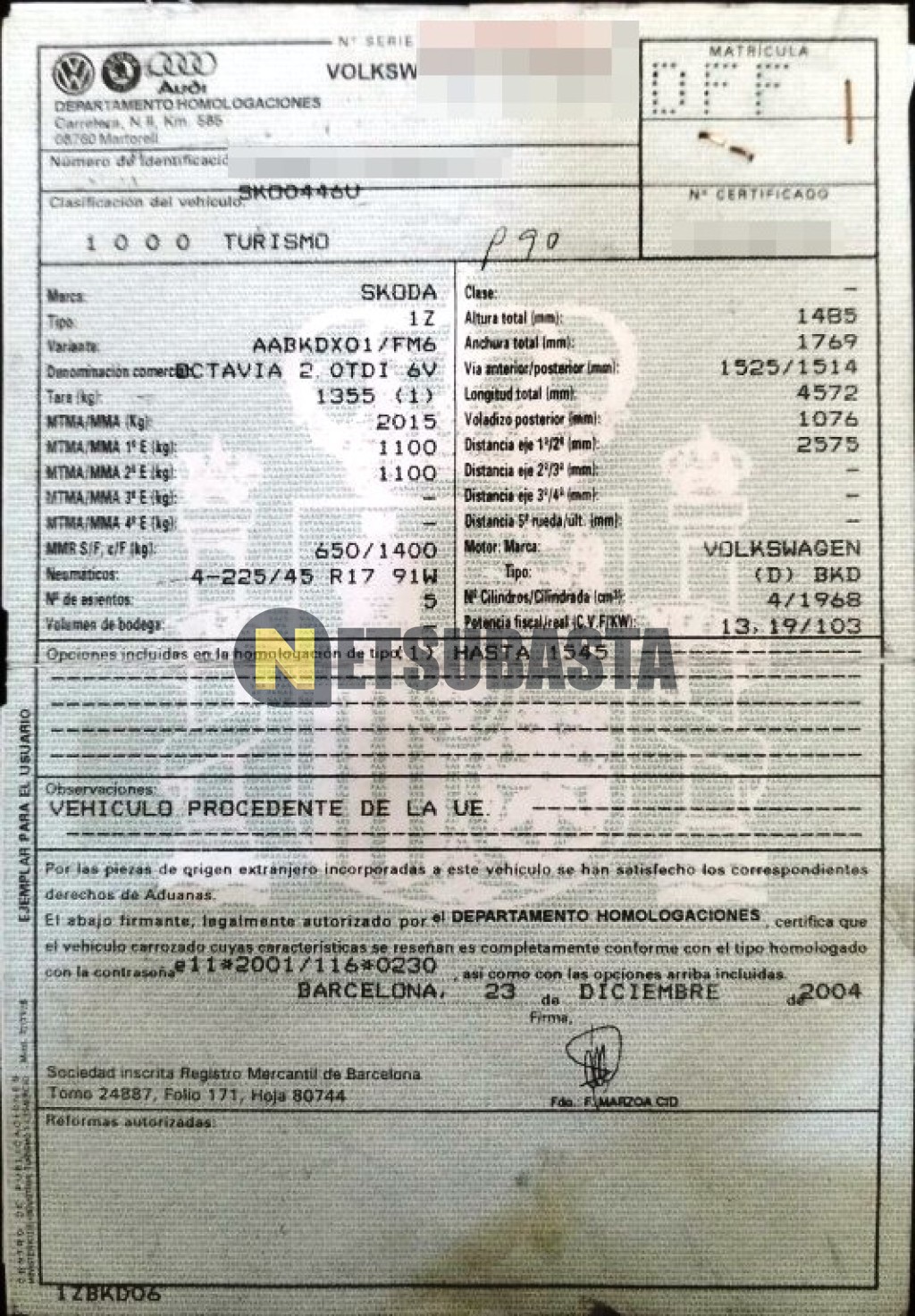 Subasta de Skoda Octavia 2.0 TDI 2004 Averiados, Marca Skoda, Modelo Octavia 2.0 TDI, Combustible Diésel, Kilometraje 340.000 KM, Fecha 1ª matriculación 12/2004, Matrícula ****DFF, Color Exterior , Color Interior , IVA REBU y Ubicación Alicante.