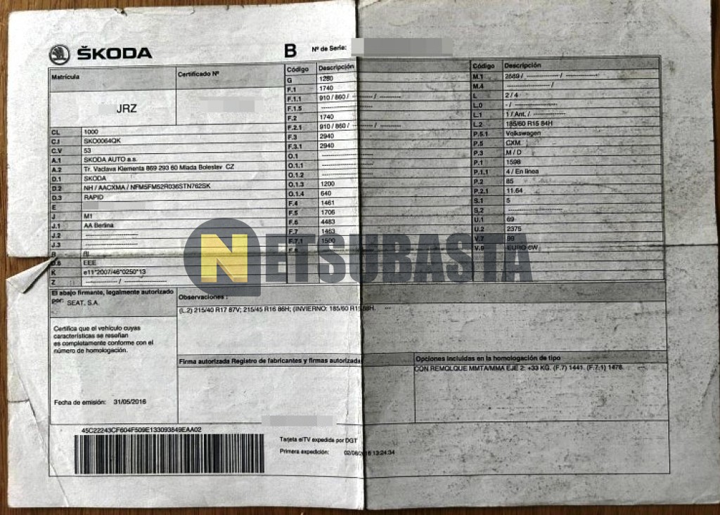 Subasta de Skoda Rapid 1.6 TDI 2016 Siniestrados, Marca Skoda, Modelo Rapid 1.6 TDI , Combustible Diésel, Kilometraje 410.000 KM, Fecha 1ª matriculación 08/2016, Matrícula ****JRZ, Color Exterior , Color Interior , IVA REBU y Ubicación Madrid.