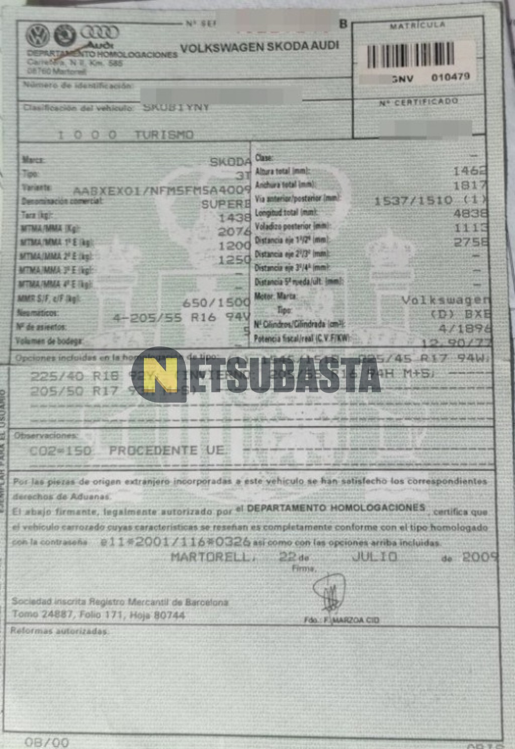 Subasta de Skoda Superb 1.9 TDI 2009 Averiados, Marca Skoda, Modelo Superb 1.9 TDI, Combustible Diésel, Kilometraje 179.000 KM, Fecha 1ª matriculación 07/2009, Matrícula ****GNV, Color Exterior , Color Interior , IVA REBU y Ubicación Alicante.