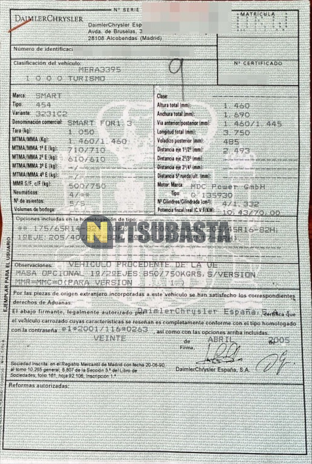 Recuerde que si lo desea, puede imprimir la ficha del vehículo Smart forfour 1.3 softouch plus 2005 con todas sus características técnicas.