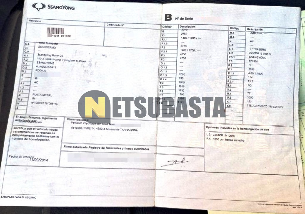 Subasta de SsangYong Rodius 2.0 eXdi 2014 Averiados, Marca SsangYong, Modelo Rodius 2.0 eXdi, Combustible Diésel, Kilometraje 250.000 KM, Fecha 1ª matriculación 04/2014, Matrícula ****HWM, Color Exterior , Color Interior , IVA REBU y Ubicación Cádiz.