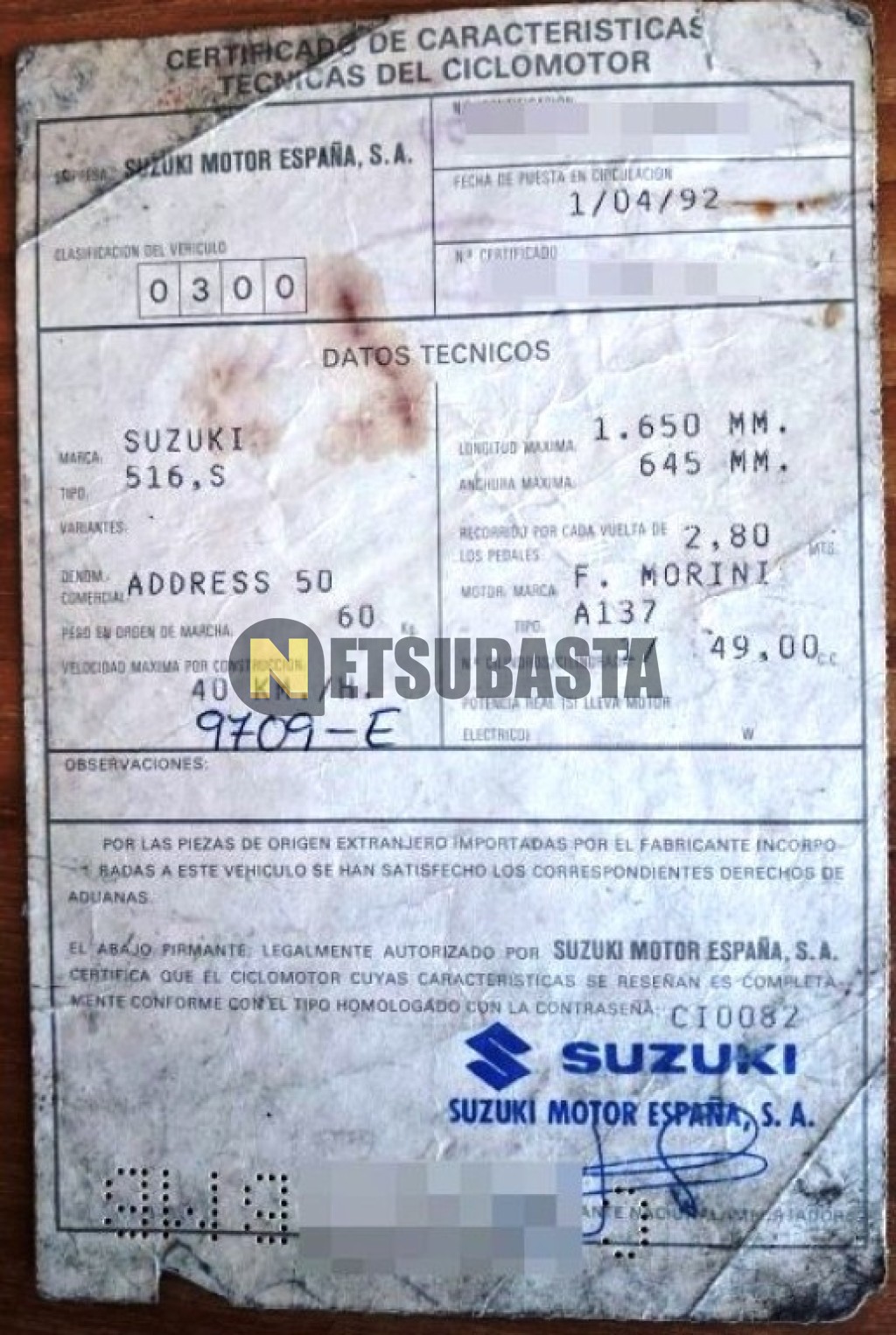 Subasta de Suzuki Address 50 2001 Averiados, Marca Suzuki, Modelo Address 50, Combustible Gasolina, Kilometraje 43.000 KM, Fecha 1ª matriculación 11/2001, Matrícula C****BMB, Color Exterior , Color Interior , IVA REBU y Ubicación Barcelona.