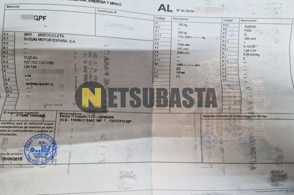 Subasta de Suzuki BURGMAN 125 2009 Siniestrados, Marca Suzuki, Modelo BURGMAN 125, Combustible Gasolina, Kilometraje 60.000 KM, Fecha 1ª matriculación 08/2009, Matrícula ****GPF, Color Exterior , Color Interior , IVA REBU y Ubicación Madrid.