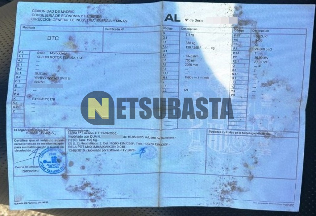 Subasta de Suzuki Burgman 250 2005 Averiados, Marca Suzuki, Modelo Burgman 250, Combustible Gasolina, Kilometraje 35.000 KM, Fecha 1ª matriculación 12/2005, Matrícula ****DTC, Color Exterior , Color Interior , IVA REBU y Ubicación Madrid.