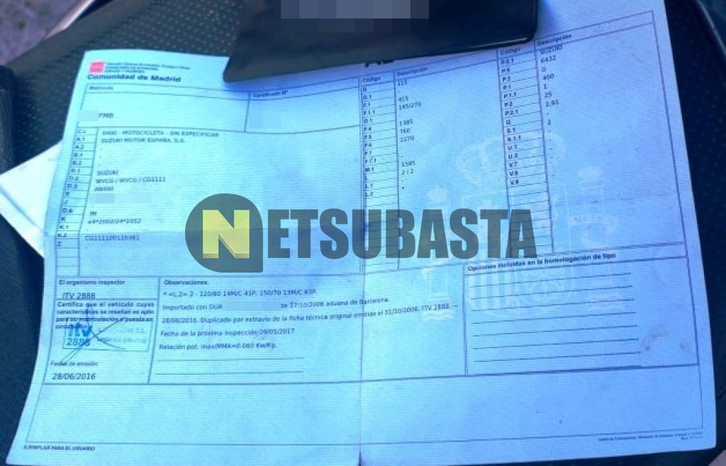 Subasta de Suzuki Burgman 400 2007 Averiados, Marca Suzuki, Modelo Burgman 400, Combustible Gasolina, Kilometraje 55.000 KM, Fecha 1ª matriculación 03/2007, Matrícula ****FMB, Color Exterior , Color Interior , IVA REBU y Ubicación Madrid.