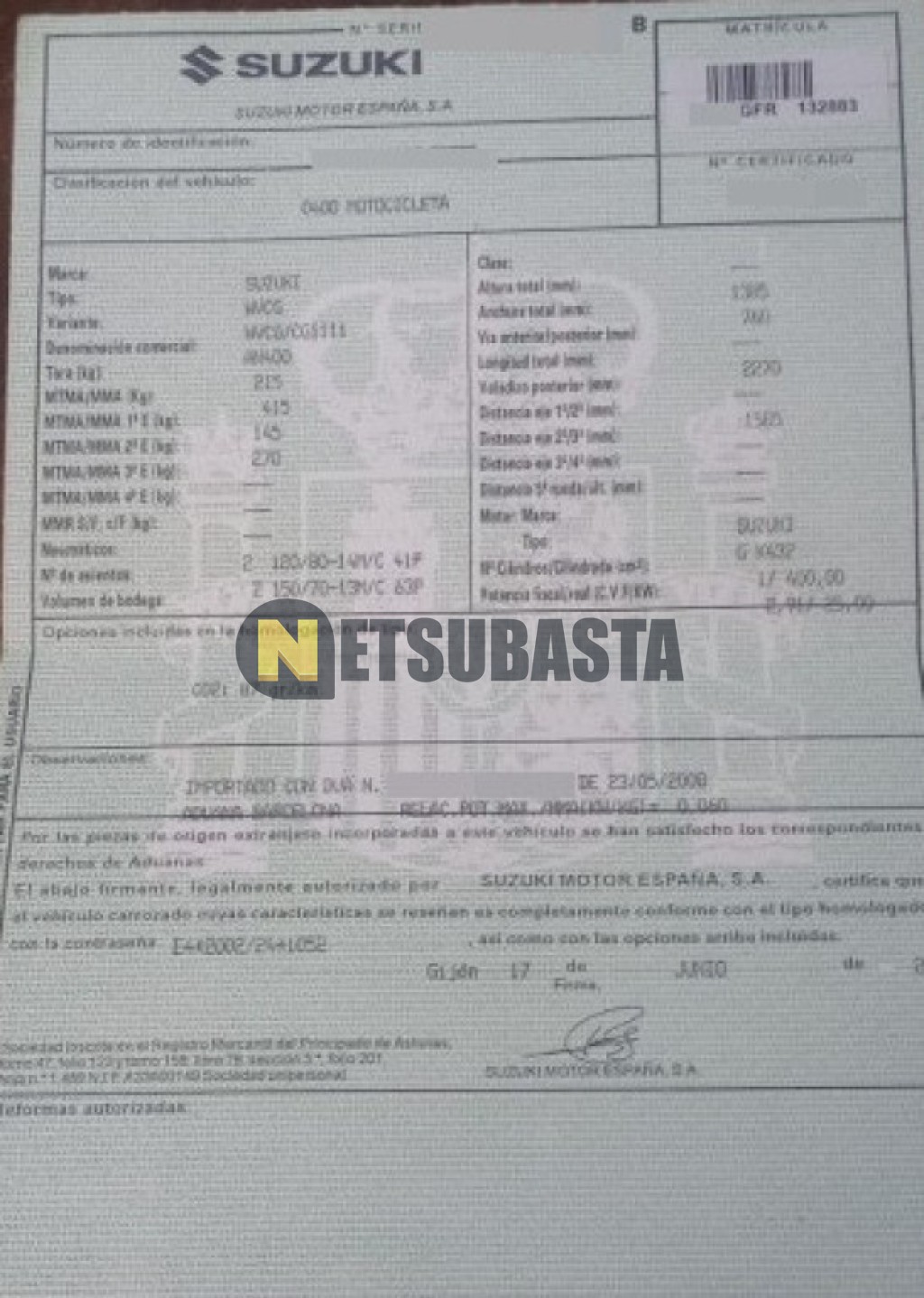 Subasta de Suzuki BURGMAN 400 2008 Averiados, Marca Suzuki, Modelo BURGMAN 400, Combustible Gasolina, Kilometraje 70.000 KM, Fecha 1ª matriculación 06/2008, Matrícula ****GFR, Color Exterior , Color Interior , IVA REBU y Ubicación Madrid.