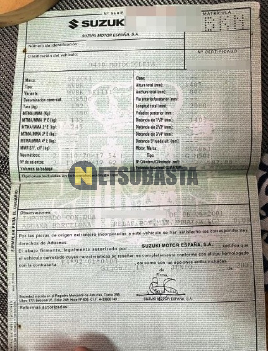 Subasta de Suzuki GS 500 E 2001 Averiados, Marca Suzuki, Modelo GS 500 E, Combustible Gasolina, Kilometraje DESCONOCIDO , Fecha 1ª matriculación 06/2001, Matrícula ****BKN, Color Exterior , Color Interior , IVA REBU y Ubicación Islas Baleares.