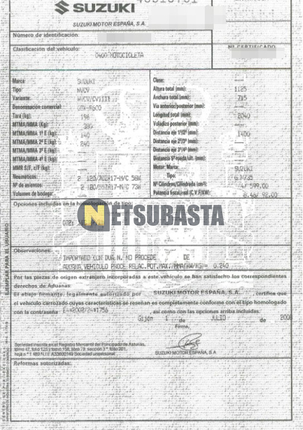 Subasta de Suzuki GSX-R 600 2008 Siniestrados, Marca Suzuki, Modelo GSX-R 600, Combustible Gasolina, Kilometraje 30.000 KM, Fecha 1ª matriculación 11/2008, Matrícula ****GJM, Color Exterior , Color Interior , IVA REBU y Ubicación Valencia.