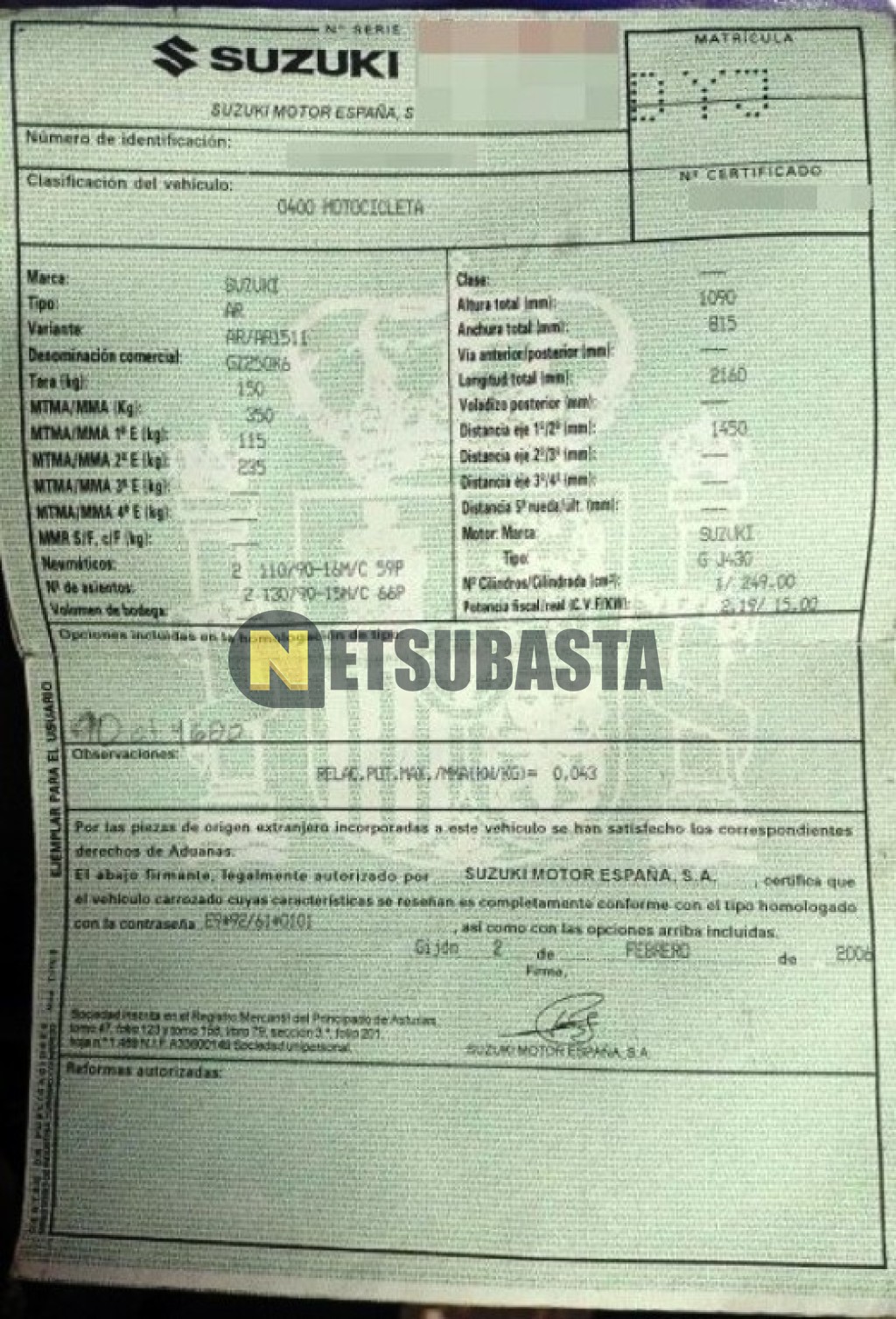 Subasta de Suzuki Marauder 250 2006 Averiados, Marca Suzuki, Modelo Marauder 250, Combustible Gasolina, Kilometraje 50.000 KM, Fecha 1ª matriculación 04/2006, Matrícula ****DYJ, Color Exterior , Color Interior , IVA REBU y Ubicación Madrid.