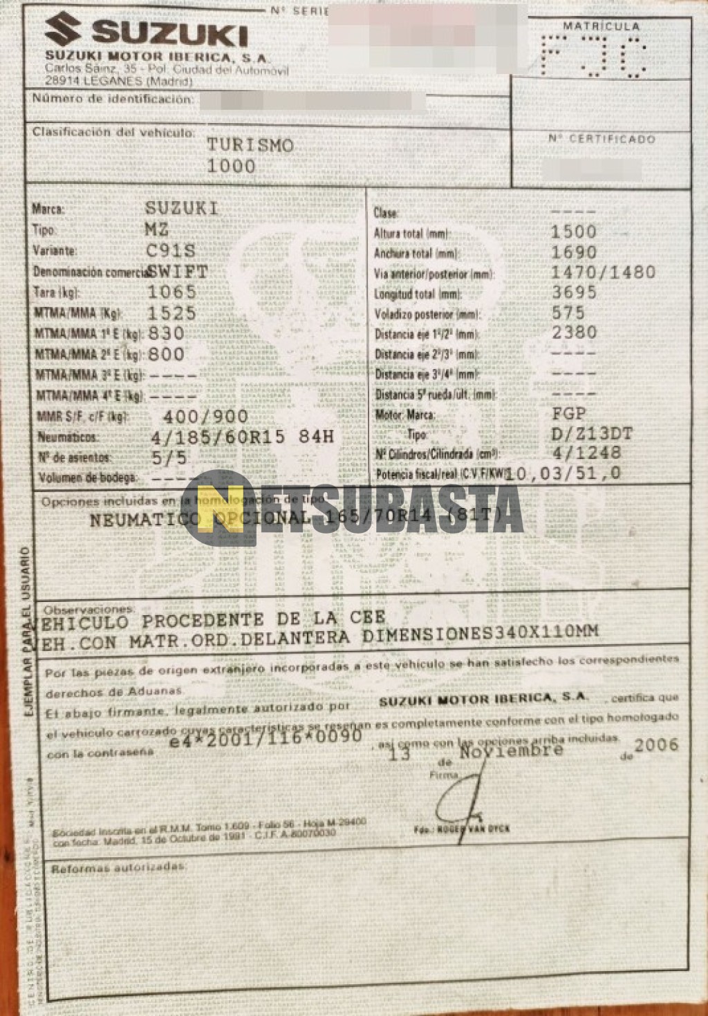 Subasta de Suzuki Swift 1.3 DDiS 2006 Averiados, Marca Suzuki, Modelo Swift 1.3 DDiS, Combustible Diésel, Kilometraje 35.000 KM, Fecha 1ª matriculación 11/2006, Matrícula ****FJC, Color Exterior , Color Interior , IVA REBU y Ubicación Madrid.