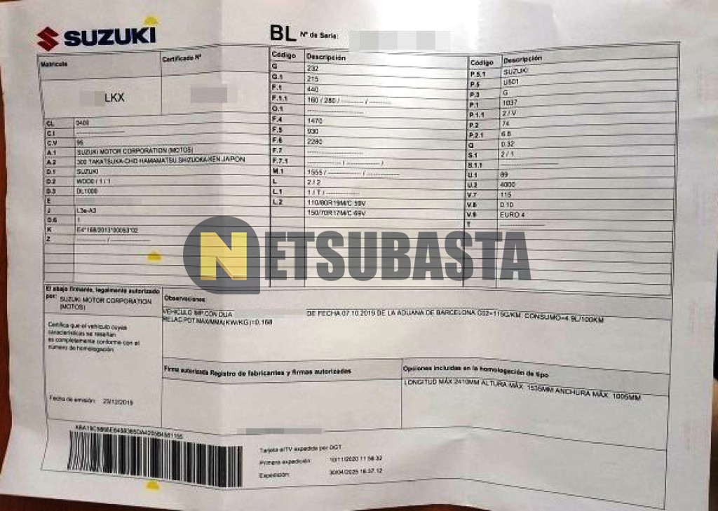 Subasta de Suzuki V-Strom 1000 ABS 2020 Averiados, Marca Suzuki, Modelo V-Strom 1000 ABS, Combustible Gasolina, Kilometraje DESCONOCIDO, Fecha 1ª matriculación 11/2020, Matrícula ****LKX, Color Exterior , Color Interior , IVA REBU y Ubicación Valencia.