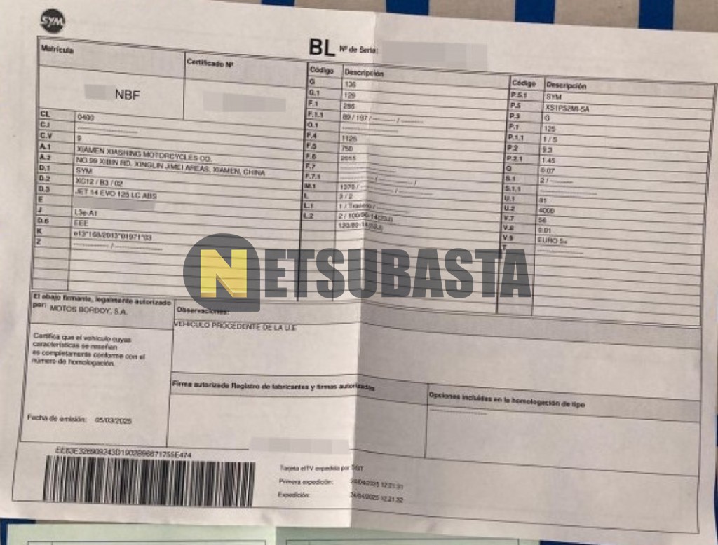 Subasta de SYM Jet Evo 125 ABS 2025 Siniestrados, Marca SYM, Modelo Jet Evo 125 ABS, Combustible Gasolina, Kilometraje 5.000 KM, Fecha 1ª matriculación 04/2025, Matrícula ****NBF, Color Exterior , Color Interior , IVA REBU y Ubicación Barcelona.