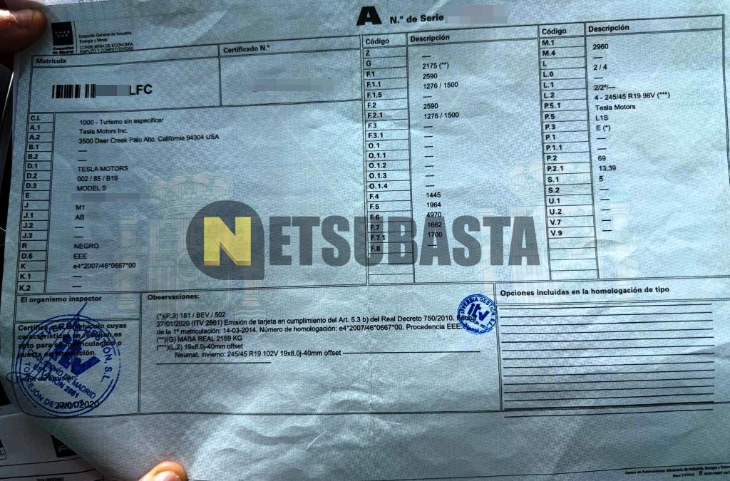 Subasta de Tesla Model S 60 kWh 2014 Siniestrados, Marca Tesla, Modelo Model S 60 kWh, Combustible Eléctrico, Kilometraje 225.000 KM, Fecha 1ª matriculación 03/2014, Matrícula ****LFC, Color Exterior , Color Interior , IVA REBU y Ubicación Madrid.