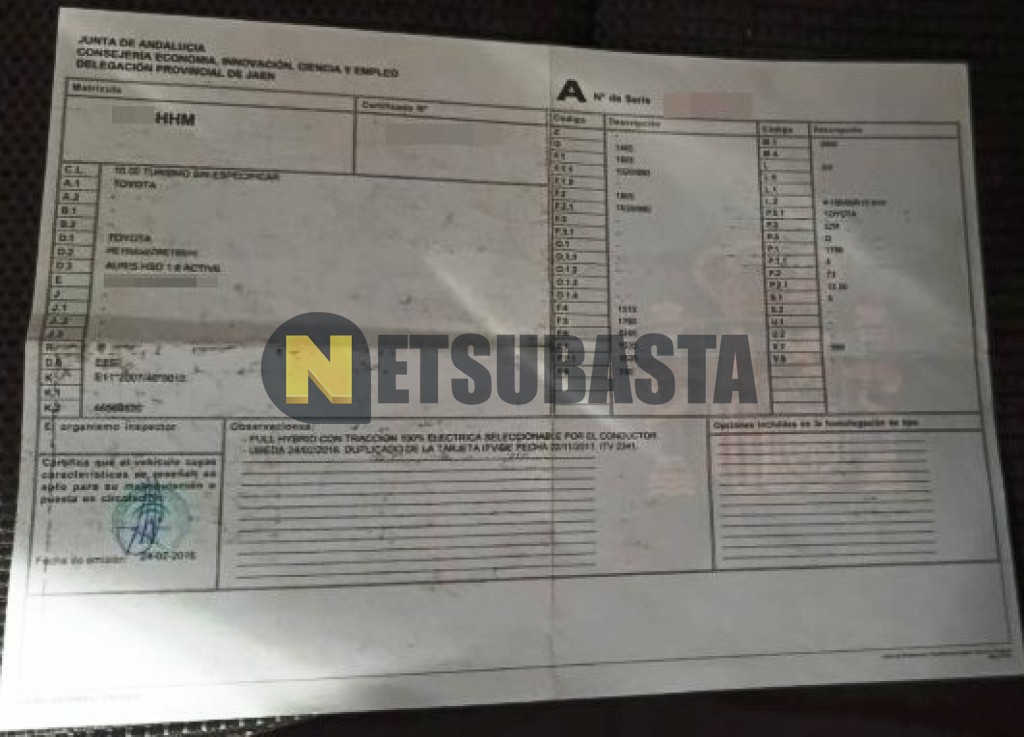 Subasta de Toyota Auris 1.8 Híbrido HSD 2011 Averiados, Marca Toyota, Modelo Auris 1.8 Híbrido HSD, Combustible Híbrido (Electro/Gasolina), Kilometraje 300.000 KM, Fecha 1ª matriculación 12/2011, Matrícula ****HHM, Color Exterior , Color Interior , IVA REBU y Ubicación Jaén.