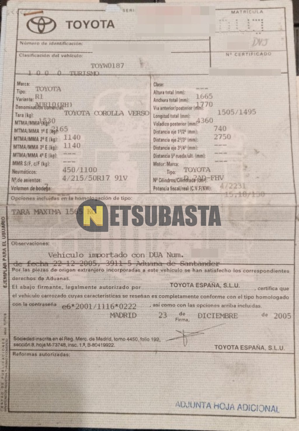 Recuerde que si lo desea, puede imprimir la ficha del vehículo Toyota Corolla Verso 2.2 D4D 2006 con todas sus características técnicas.