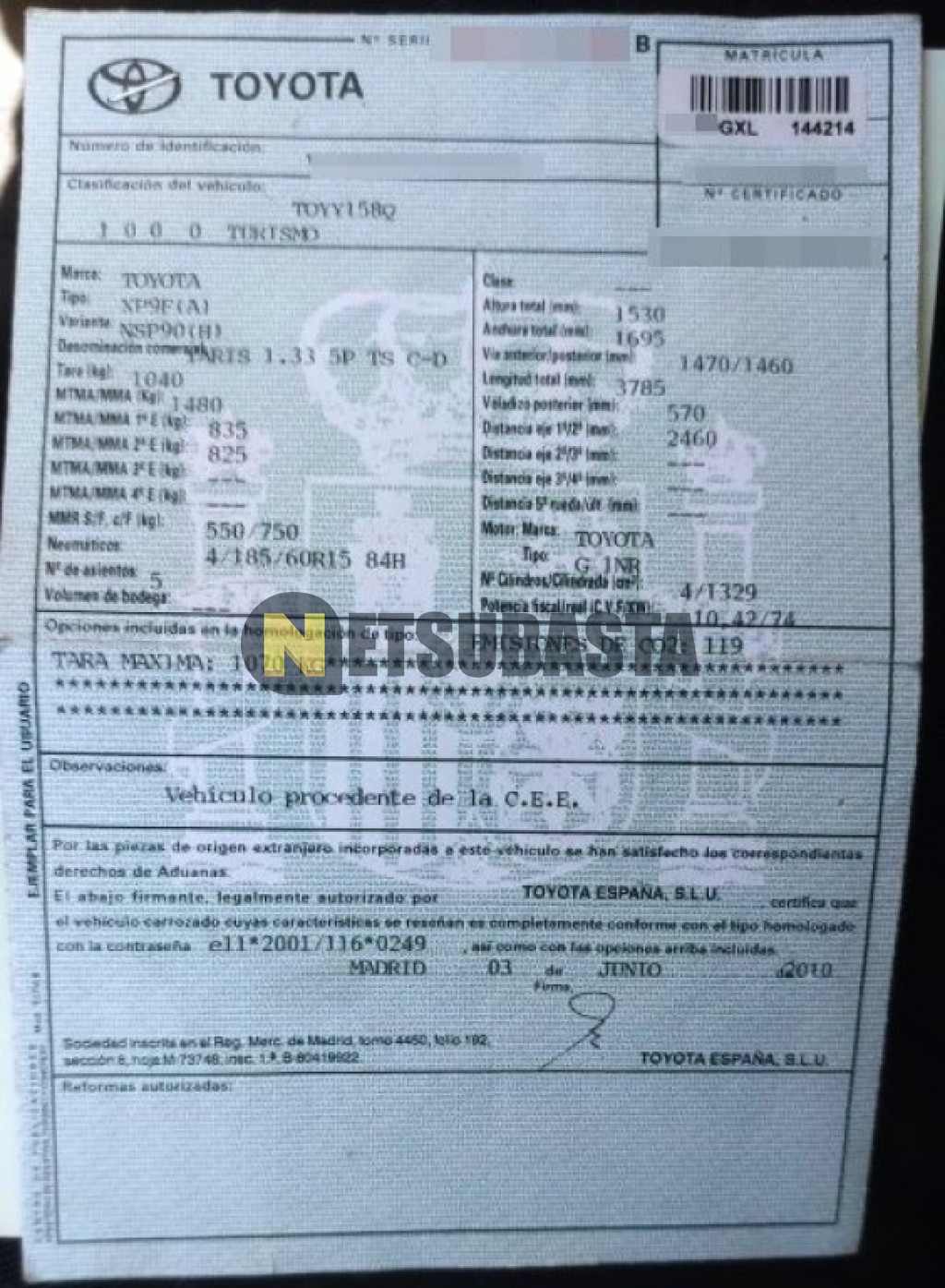 Subasta de Toyota Yaris 1.3 VVT-i TS Confortdrive 2010 Averiados, Marca Toyota, Modelo Yaris 1.3 VVT-i TS Confortdrive, Combustible Gasolina, Kilometraje 71.000 KM, Fecha 1ª matriculación 06/2010, Matrícula ****GXL, Color Exterior , Color Interior , IVA REBU y Ubicación Madrid.
