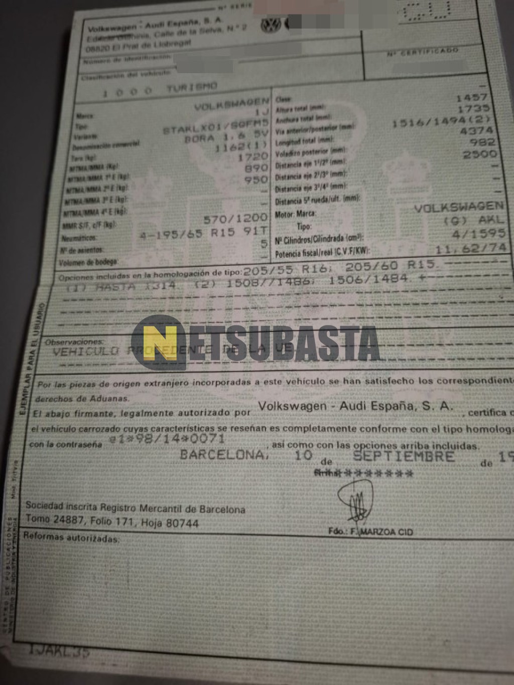 Subasta de Volkswagen Bora 1.6 1999 Averiados, Marca Volkswagen, Modelo Bora 1.6, Combustible Gasolina, Kilometraje 175.000 KM, Fecha 1ª matriculación 09/1999, Matrícula V****GU, Color Exterior , Color Interior , IVA REBU y Ubicación Valencia.