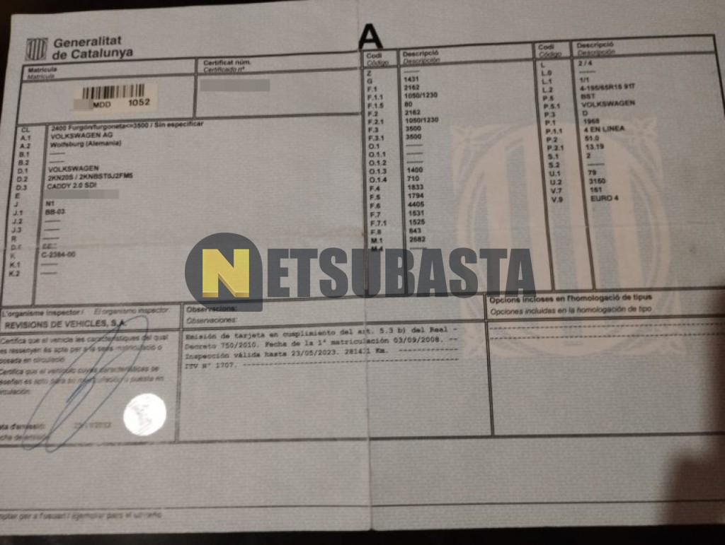 Subasta de Volkswagen Caddy 2.0 SDI 2008 Averiados, Marca Volkswagen, Modelo Caddy 2.0 SDI, Combustible Diésel, Kilometraje 370.000 KM, Fecha 1ª matriculación 09/2008, Matrícula ****MDD, Color Exterior , Color Interior , IVA REBU y Ubicación Barcelona.
