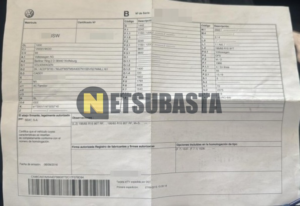 Subasta de Volkswagen Caddy 2.0 TDI 2016 Siniestrados, Marca Volkswagen, Modelo Caddy 2.0 TDI, Combustible Diésel, Kilometraje 210.000 KM, Fecha 1ª matriculación 09/2016, Matrícula ****JSW, Color Exterior , Color Interior , IVA REBU y Ubicación Huelva.