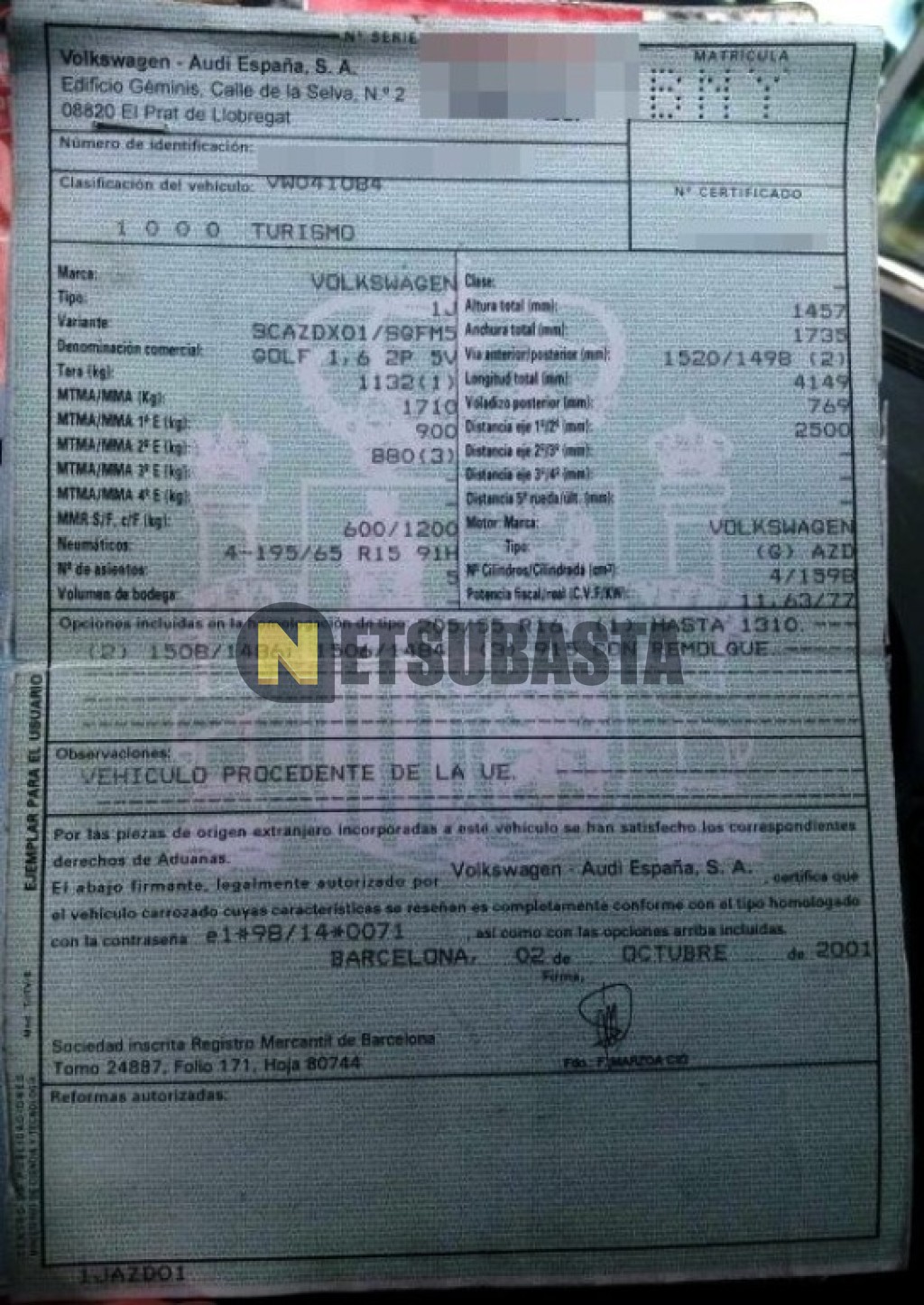 Subasta de Volkswagen Golf 1.6 2001 Averiados, Marca Volkswagen, Modelo Golf 1.6, Combustible Gasolina, Kilometraje 196.000 KM, Fecha 1ª matriculación 10/2001, Matrícula ****BNY, Color Exterior , Color Interior , IVA REBU y Ubicación Valencia.