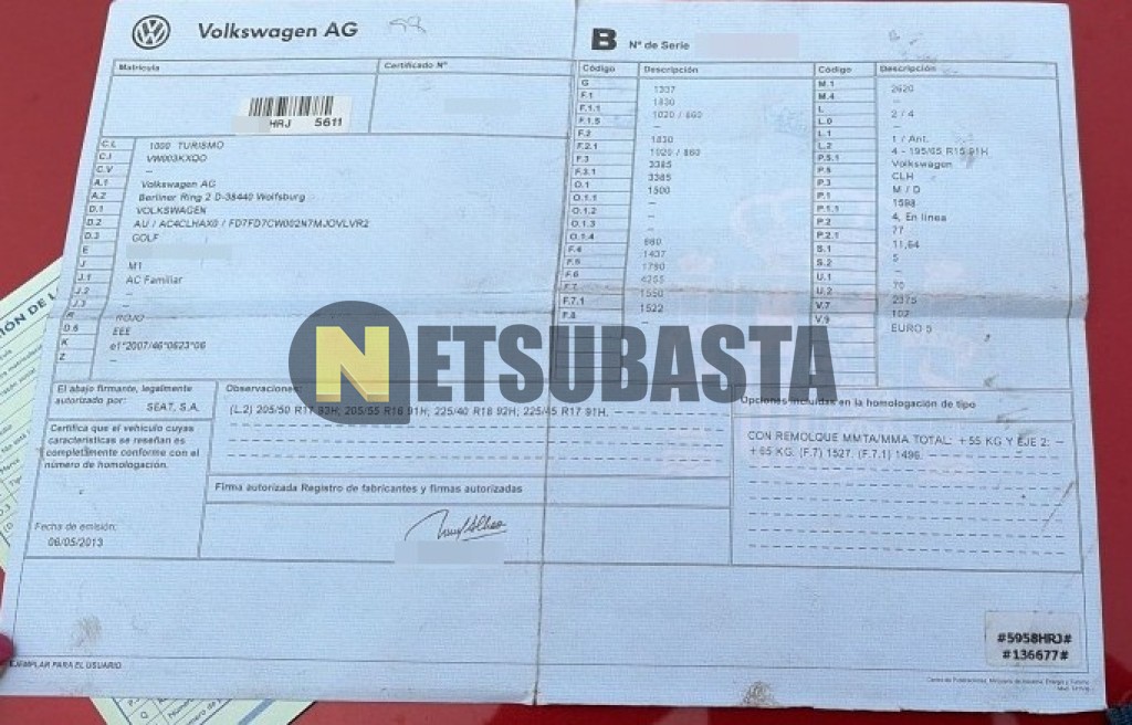 Subasta de Volkswagen Golf 1.6 TDI DSG 7 vel. 2013 Averiados, Marca Volkswagen, Modelo Golf 1.6 TDI DSG 7 vel., Combustible Diésel, Kilometraje 353.000 KM, Fecha 1ª matriculación 05/2013, Matrícula ****HRJ, Color Exterior , Color Interior , IVA REBU y Ubicación Ávila.