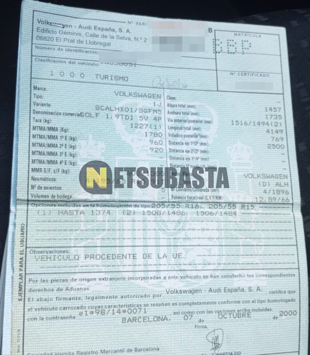 Subasta de Volkswagen Golf 1.9 TDI 2000 Averiados, Marca Volkswagen, Modelo Golf 1.9 TDI, Combustible Diésel, Kilometraje 300.000 KM, Fecha 1ª matriculación 10/2000, Matrícula ****BBP, Color Exterior , Color Interior , IVA REBU y Ubicación Tarragona.