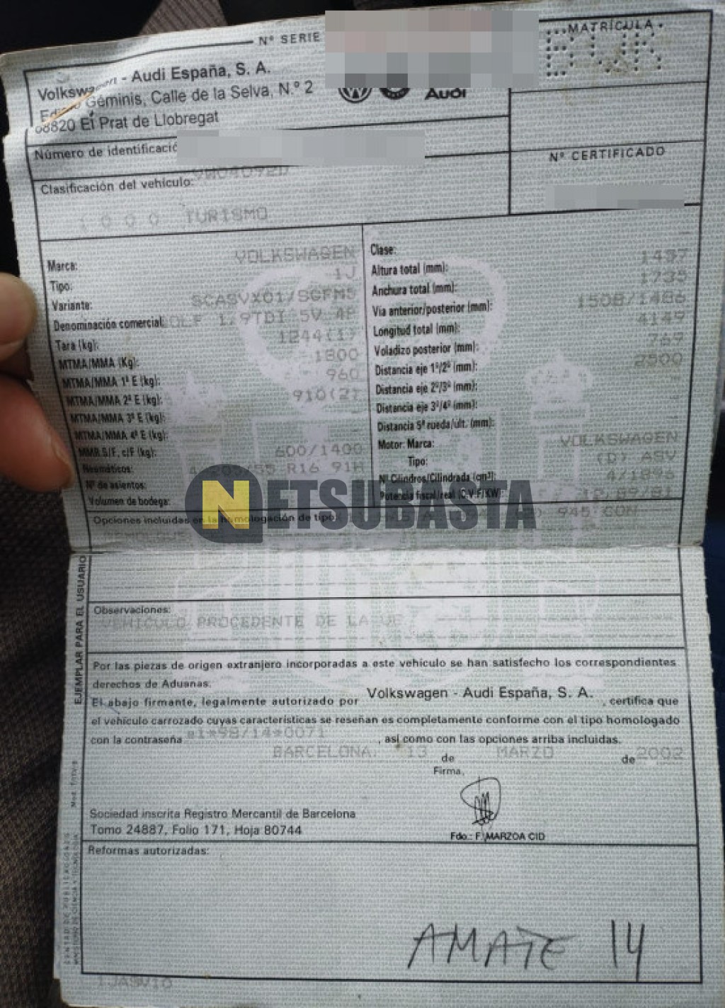 Subasta de Volkswagen Golf 1.9 TDI 2002 Averiados, Marca Volkswagen, Modelo Golf 1.9 TDI, Combustible Diésel, Kilometraje 390.000 KM, Fecha 1ª matriculación 04/2002, Matrícula ****BVK, Color Exterior , Color Interior , IVA REBU y Ubicación Murcia.
