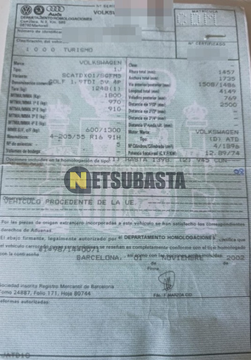 Subasta de Volkswagen Golf 1.9 TDI 2003 Averiados, Marca Volkswagen, Modelo Golf 1.9 TDI, Combustible Diésel, Kilometraje 285.000 KM, Fecha 1ª matriculación 01/2003, Matrícula ****CDM, Color Exterior , Color Interior , IVA REBU y Ubicación Valencia.