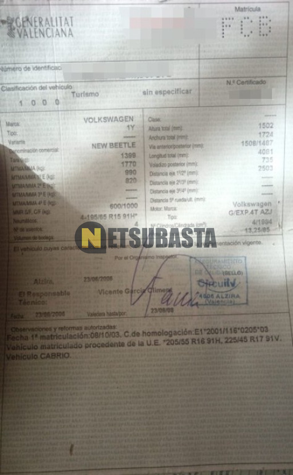 Subasta de Volkswagen New Beetle 2.0 Cabriolet 2003 Siniestrados, Marca Volkswagen, Modelo New Beetle 2.0 Cabriolet, Combustible Gasolina, Kilometraje DESCONOCIDO, Fecha 1ª matriculación 10/2003, Matrícula ****FCB, Color Exterior , Color Interior , IVA REBU y Ubicación Valencia.