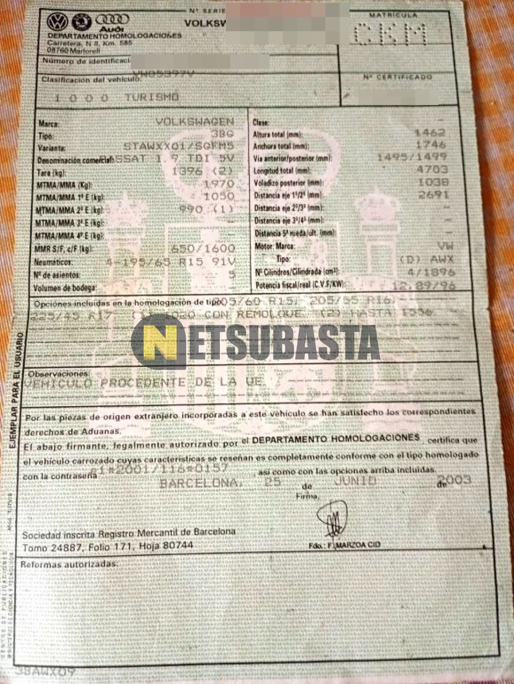 Subasta de Volkswagen Passat 1.9 TDI 2003 Siniestrados, Marca Volkswagen, Modelo Passat 1.9 TDI, Combustible Diésel, Kilometraje 295.000 KM, Fecha 1ª matriculación 07/2003, Matrícula ****CKM, Color Exterior , Color Interior , IVA REBU y Ubicación Badajoz.