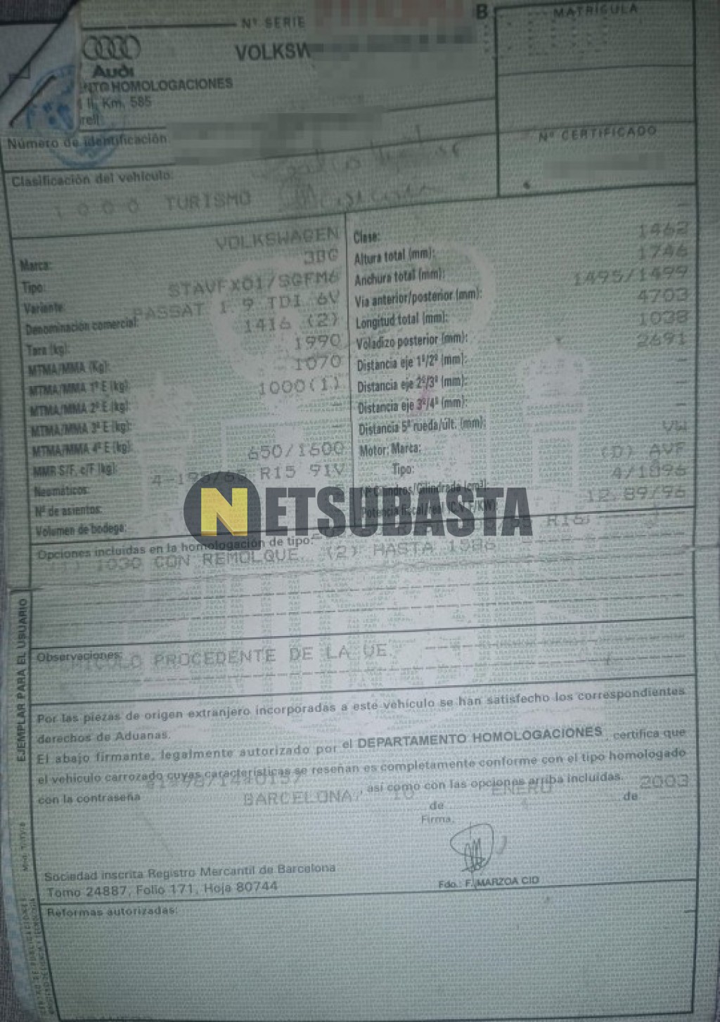 Subasta de Volkswagen Passat 1.9 TDI 2003 Averiados, Marca Volkswagen, Modelo Passat 1.9 TDI, Combustible Diésel, Kilometraje 305.000 KM, Fecha 1ª matriculación 02/2003, Matrícula ****CDW, Color Exterior , Color Interior , IVA REBU y Ubicación Madrid.