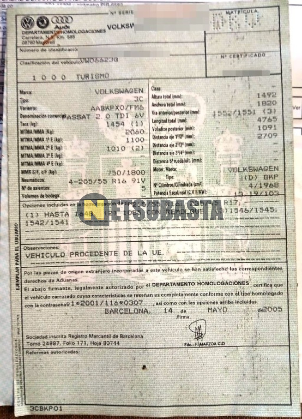 Recuerde que si lo desea, puede imprimir la ficha del vehículo Volkswagen Passat 2.0 TDI 2005 con todas sus características técnicas.