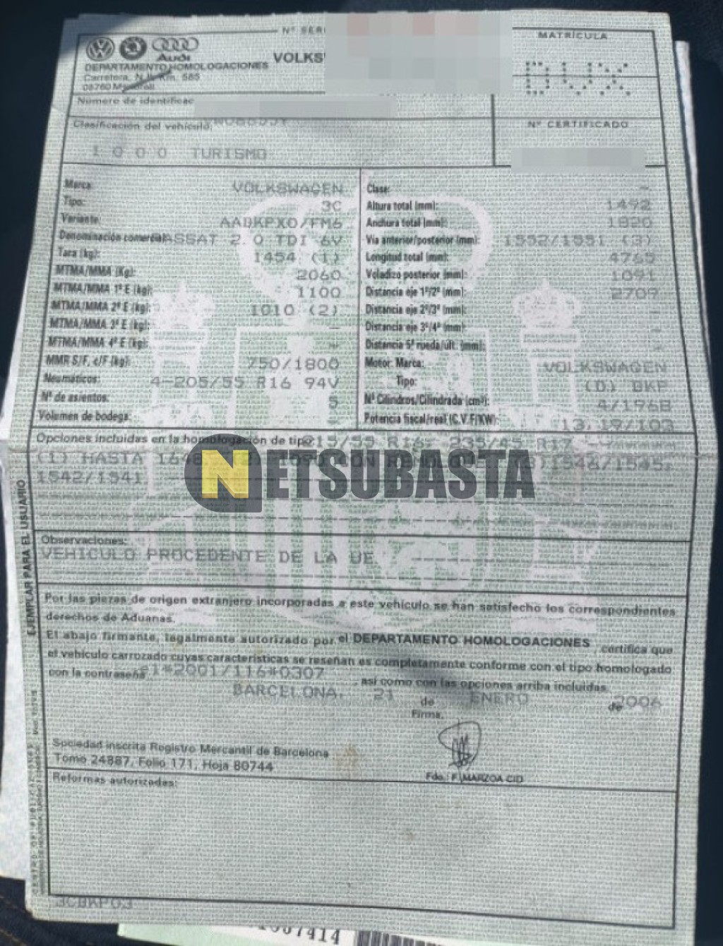 Subasta de Volkswagen Passat 2.0 TDI 2006 Averiados, Marca Volkswagen, Modelo Passat 2.0 TDI , Combustible Diésel, Kilometraje 305.000 KM, Fecha 1ª matriculación 02/2006, Matrícula ****DVX, Color Exterior , Color Interior , IVA REBU y Ubicación Granada.