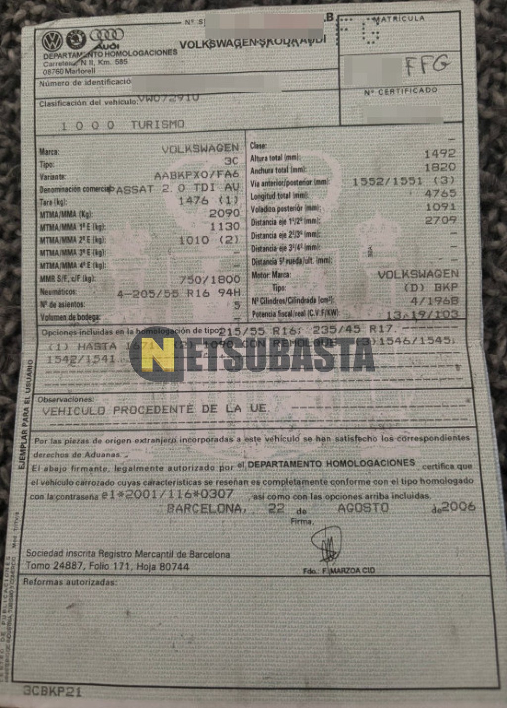 Subasta de Volkswagen Passat 2.0 TDI DSG 2006 Averiados, Marca Volkswagen, Modelo Passat 2.0 TDI DSG, Combustible Diésel, Kilometraje 290.000 KM, Fecha 1ª matriculación 08/2006, Matrícula ****FFG, Color Exterior , Color Interior , IVA REBU y Ubicación Córdoba.