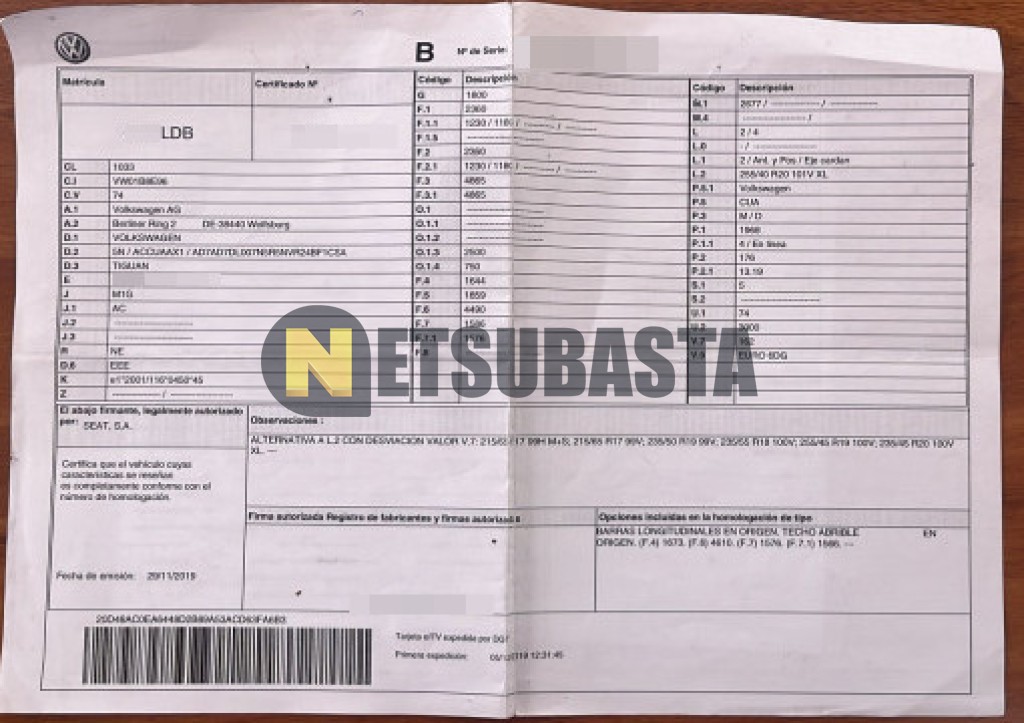 Subasta de Volkswagen Tiguan 2.0 TDI 4Motion DSG 7 vel. 2019 Siniestrados, Marca Volkswagen, Modelo Tiguan 2.0 TDI 4Motion DSG 7 vel., Combustible Diésel, Kilometraje 137.000 KM, Fecha 1ª matriculación 12/2019, Matrícula ****LDB, Color Exterior , Color Interior , IVA REBU y Ubicación Madrid.