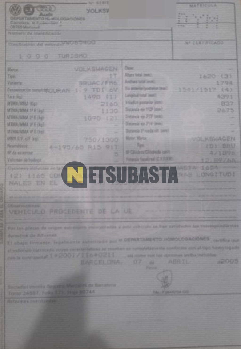 Subasta de Volkswagen Touran 1.9 TDI 2006 Siniestrados, Marca Volkswagen, Modelo Touran 1.9 TDI, Combustible Diésel, Kilometraje 236.000 KM, Fecha 1ª matriculación 04/2006, Matrícula ****DYM, Color Exterior , Color Interior , IVA REBU y Ubicación Murcia.