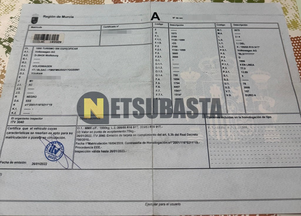 Subasta de Volkswagen Touran 1.9 TDI 2009 Siniestrados, Marca Volkswagen, Modelo Touran 1.9 TDI, Combustible Diésel, Kilometraje 235.000 KM, Fecha 1ª matriculación 04/2009, Matrícula ****LWC, Color Exterior , Color Interior , IVA REBU y Ubicación Islas Baleares.