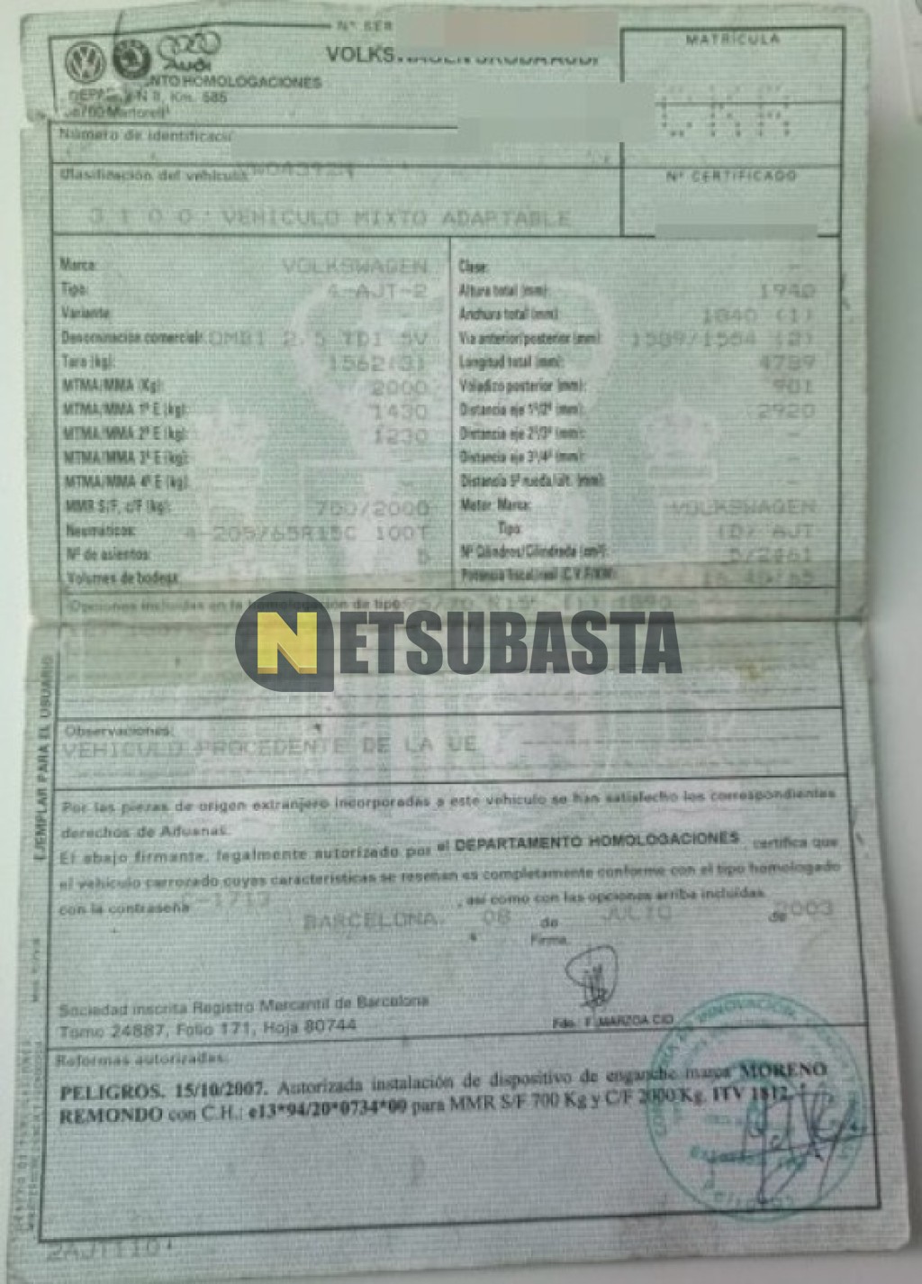 Subasta de Volkswagen Transporter 2.5 TDI 2003 Averiados, Marca Volkswagen, Modelo Transporter 2.5 TDI, Combustible Diésel, Kilometraje 490.000 KM, Fecha 1ª matriculación 07/2003, Matrícula ****CKR, Color Exterior , Color Interior , IVA REBU y Ubicación Granada.