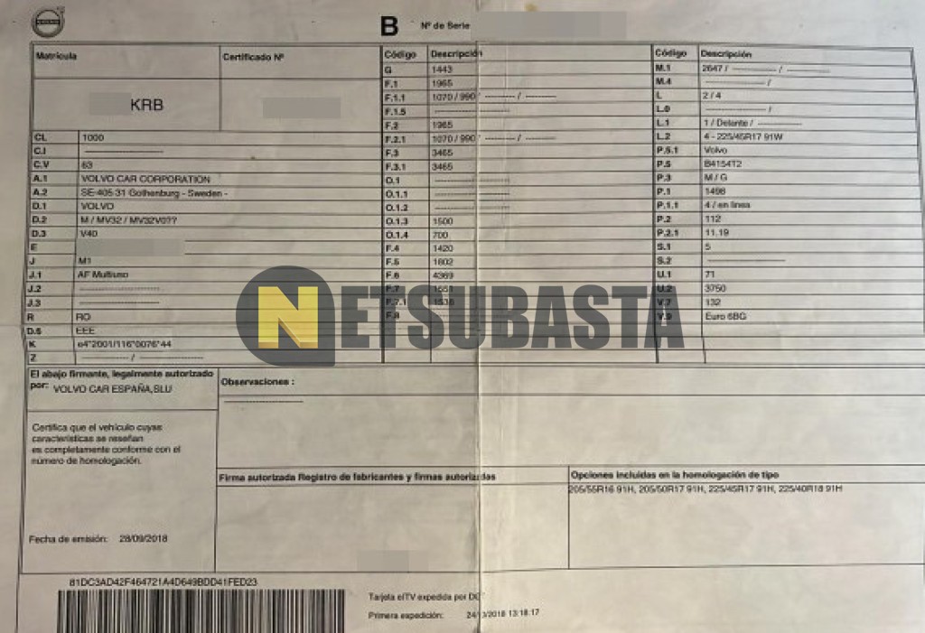 Subasta de Volvo V40 T3 Aut. 2018 Siniestrados, Marca Volvo, Modelo V40 T3 Aut., Combustible Gasolina, Kilometraje 180.000 KM, Fecha 1ª matriculación 10/2018, Matrícula ****KRB, Color Exterior , Color Interior , IVA REBU y Ubicación Sevilla.