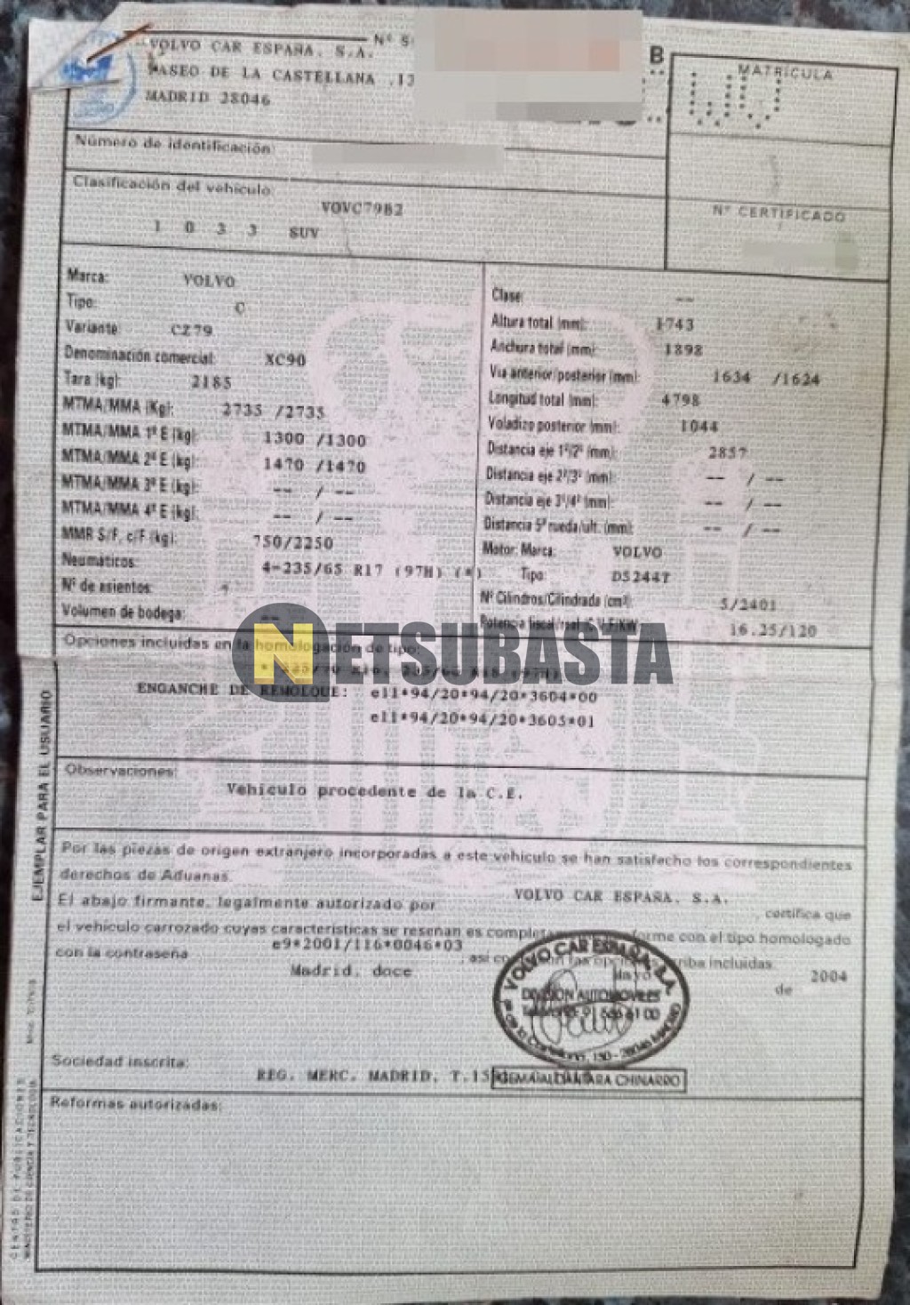 Subasta de Volvo XC90 D5 7 asientos Aut. 2004 Averiados, Marca Volvo, Modelo XC90 D5 7 asientos Aut., Combustible Diésel, Kilometraje 506.000 KM, Fecha 1ª matriculación 06/2004, Matrícula ****CWV, Color Exterior , Color Interior , IVA REBU y Ubicación Madrid.
